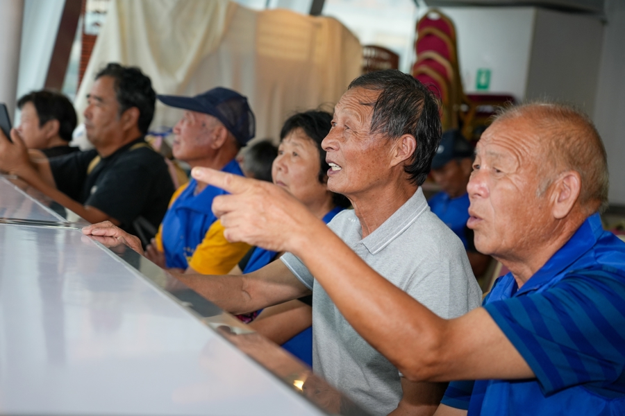 在浦江游览船上,老人们欣赏浦江两岸的风景。
