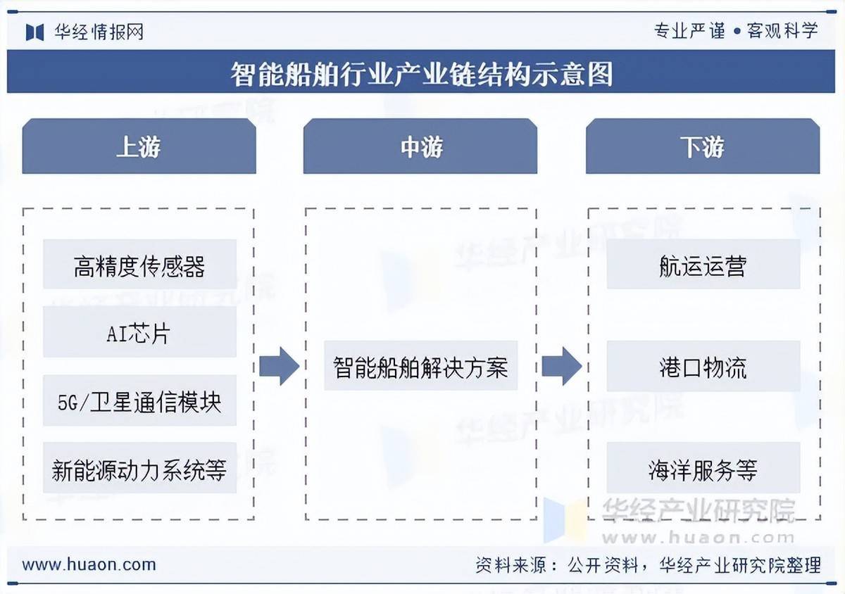 智能船舶产业链涵盖上中下游全链条:上游聚焦核心技术研发与硬件供应,包括高精度传感器、AI芯片、5G/卫星通信模块、新能源动力系统(如氢燃料电池)及数字孪生软件平台;中游以船舶设计制造与系统集成为核心,涉及船厂、智能系统集成商及船用设备供应商,推动船舶智能化改造与新型智能船舶建造;下游则面向航运运营、港口物流及海洋服务,涵盖航运企业、港口管理方、物流服务商及海洋科研机构,通过智能调度、远程监控、预测性维护等服务提升运营效率与安全水平。